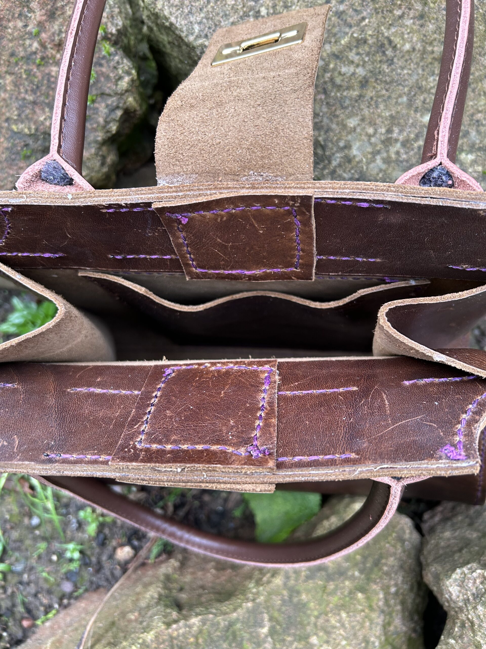 Brown Embossed Leather & Solid Mahogany & Walnut Handbag