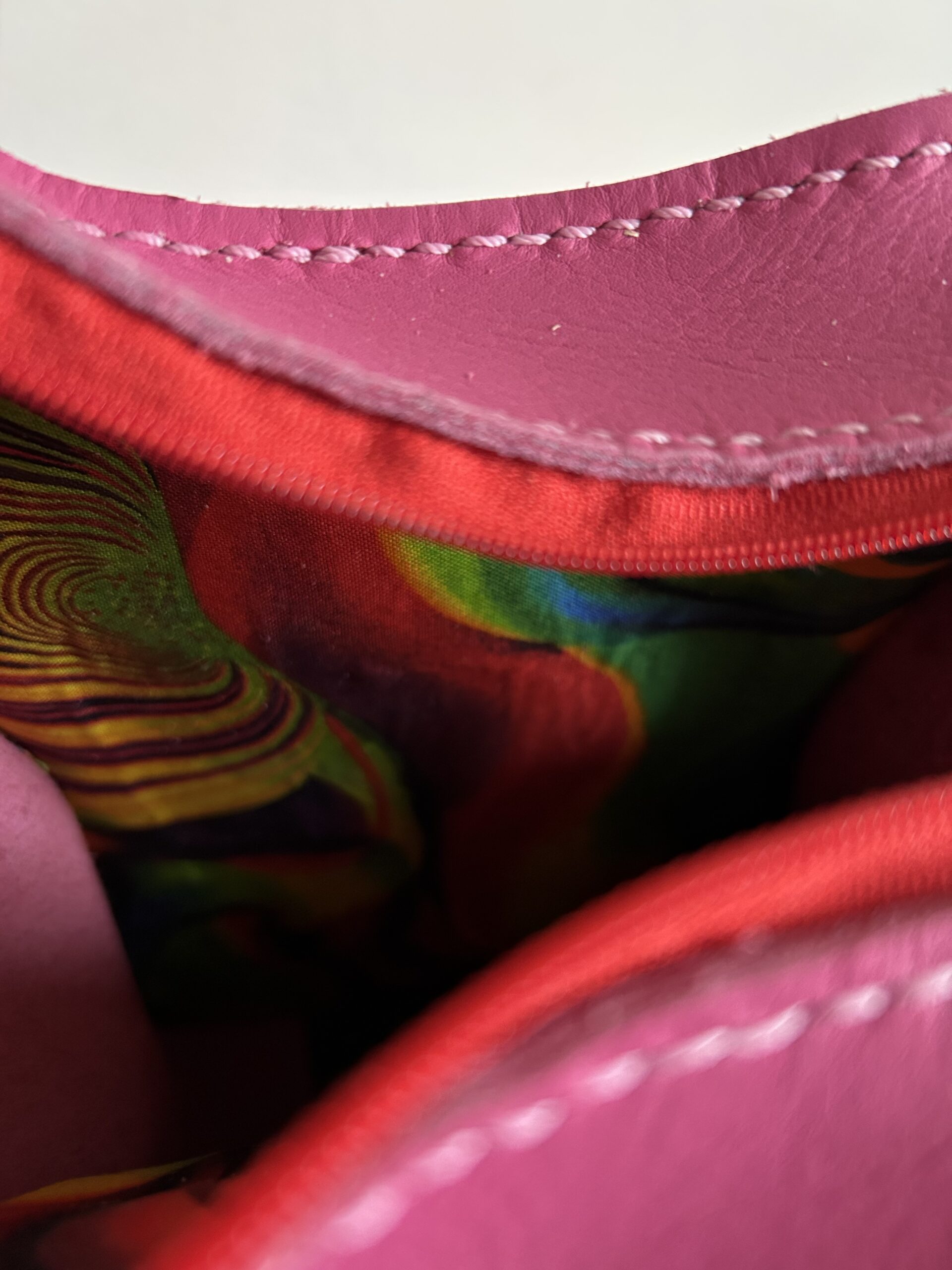 Roomy inside and Lined with swirly colourful patterned fabric.