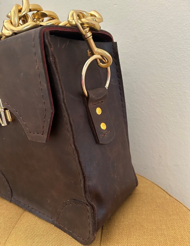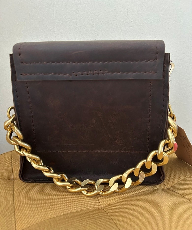 Dark Brown Leather Handbag with Chunky Gold Coloured Chain